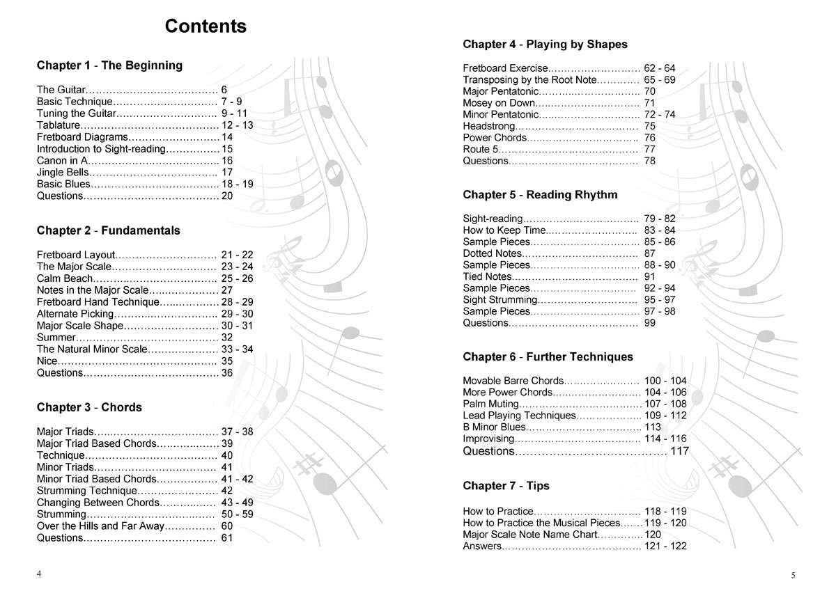 Music theory basics explained in terms of the fretboard and reinforced by musical pieces in various styles making the learning process of this guitar method book practical and enjoyable.