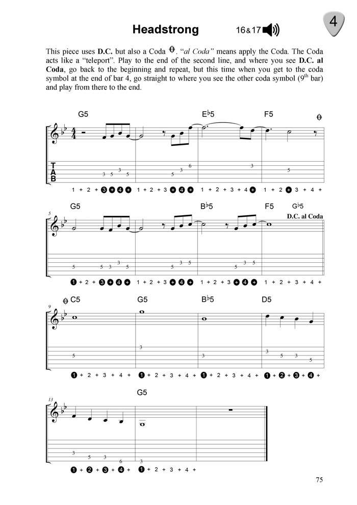 To get straight into playing music, numbers have been added underneath pieces to indicate rhythm as tablature on its own does not indicate this.