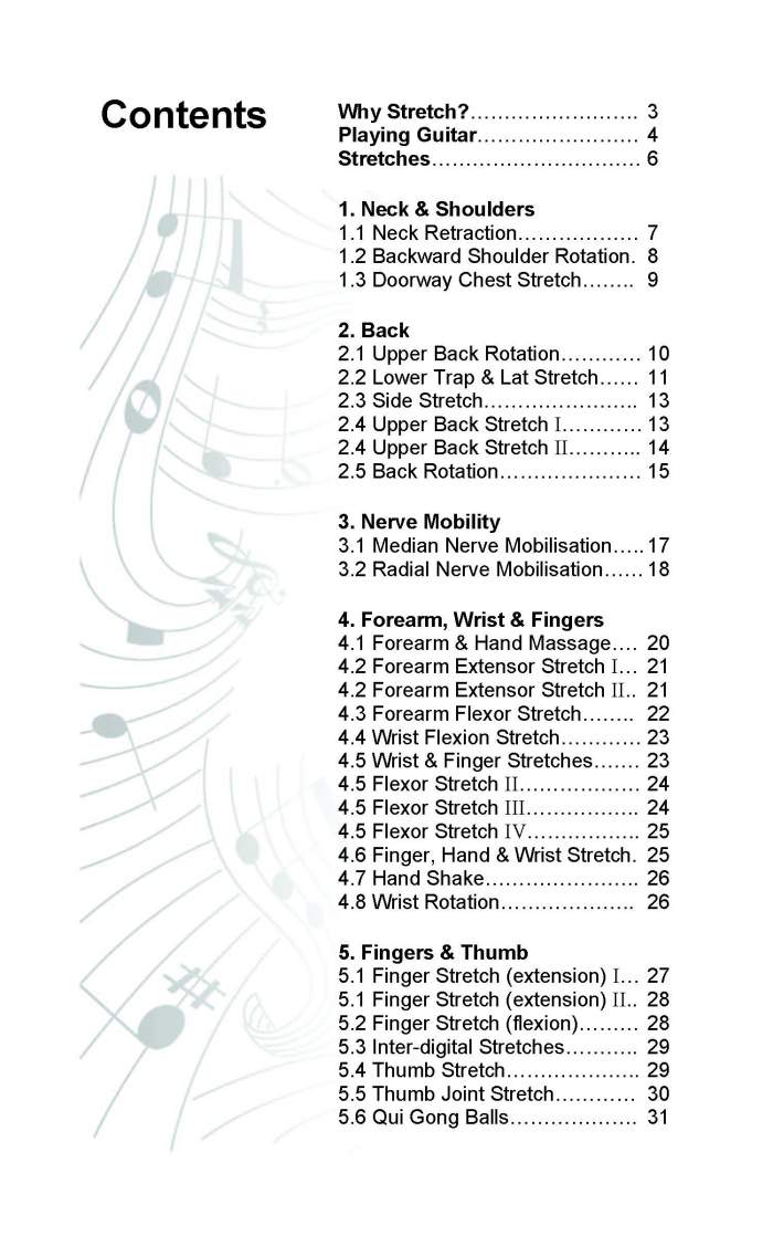 30 stretching exercises for guitarists and other musicians illustrated with over 40 professionally drawn diagrams.